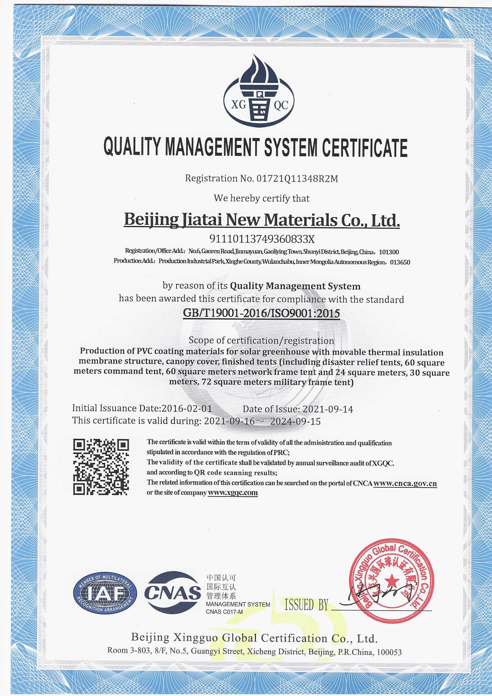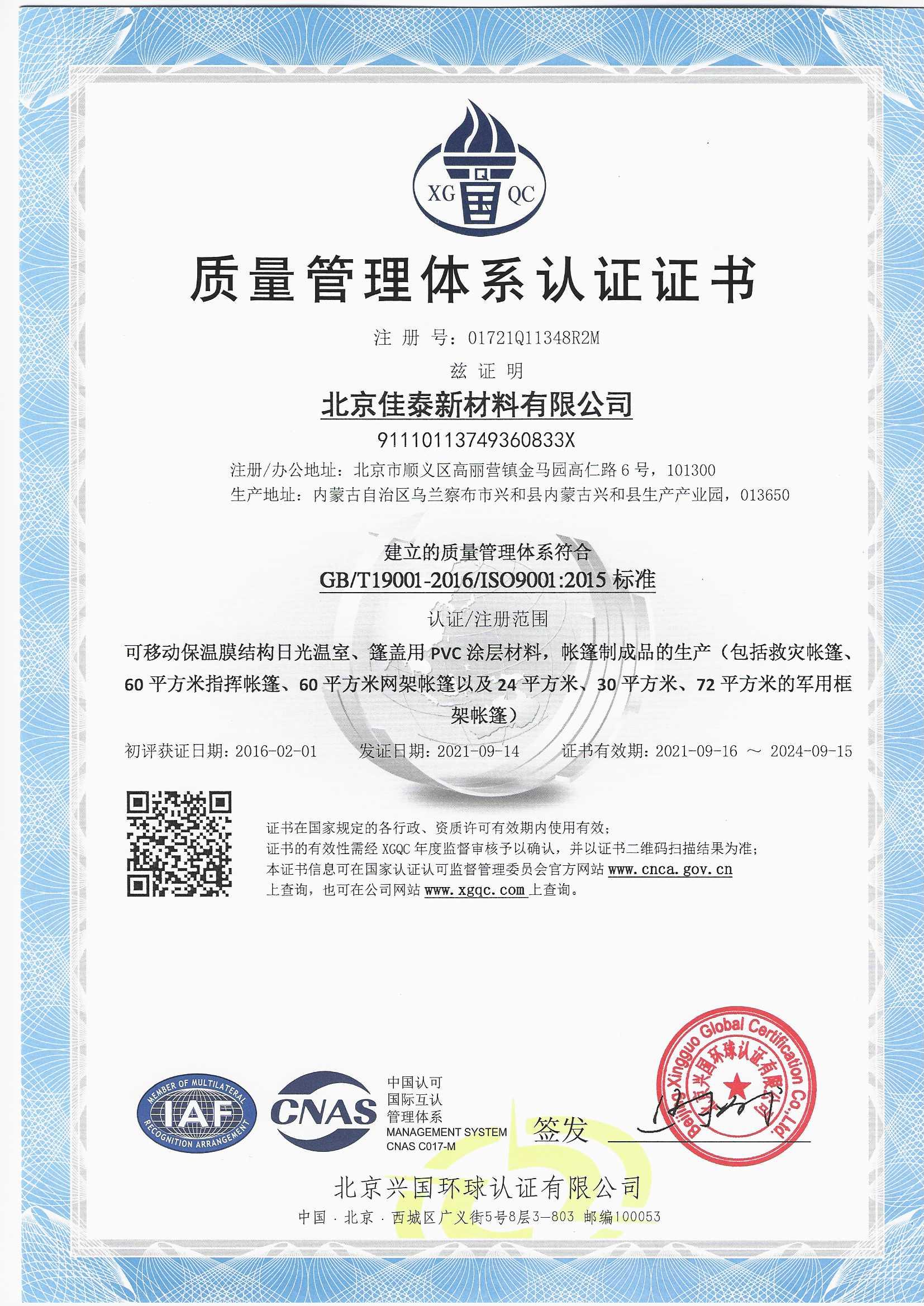 質(zhì)量環(huán)境體系認證證書(中文)