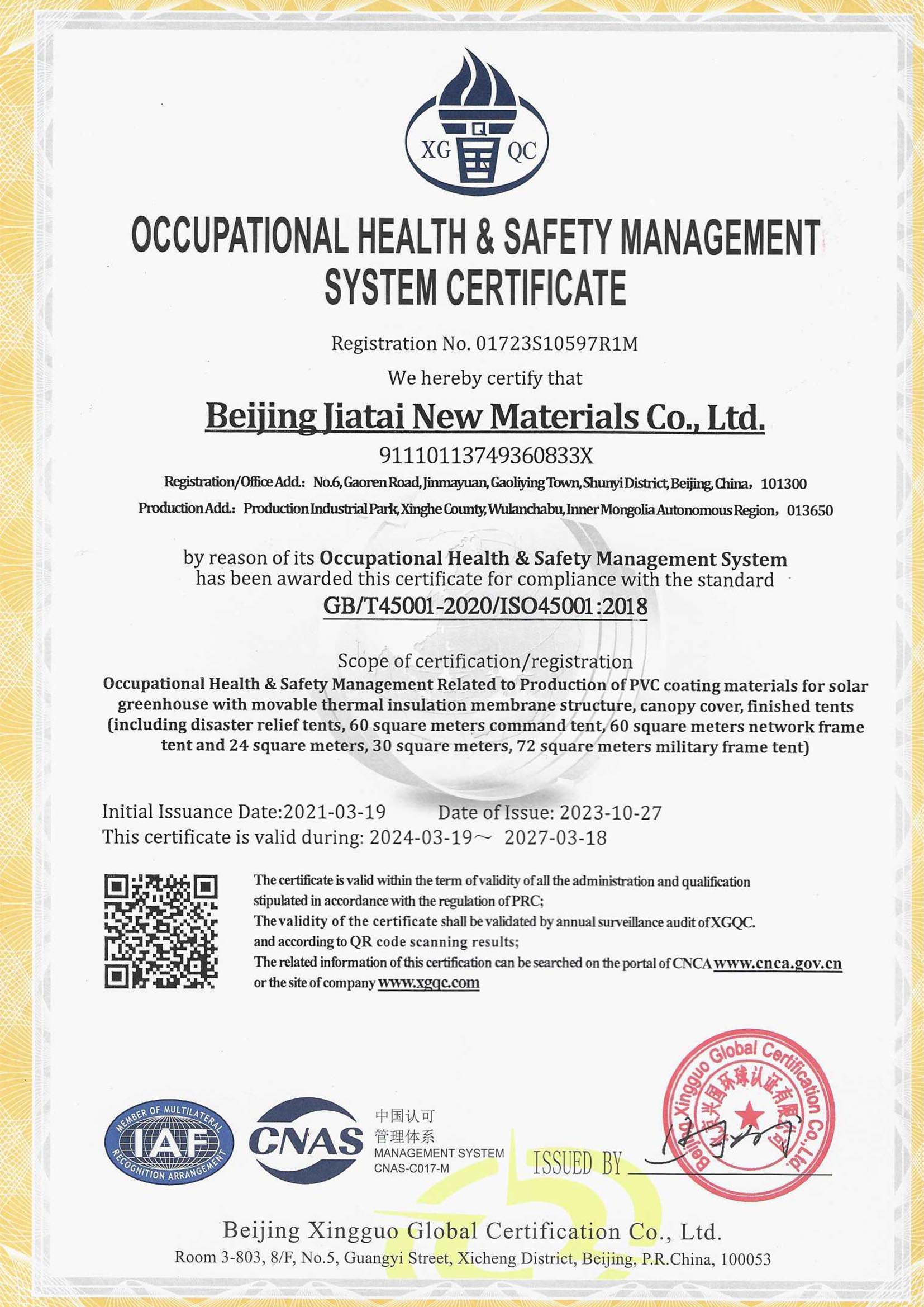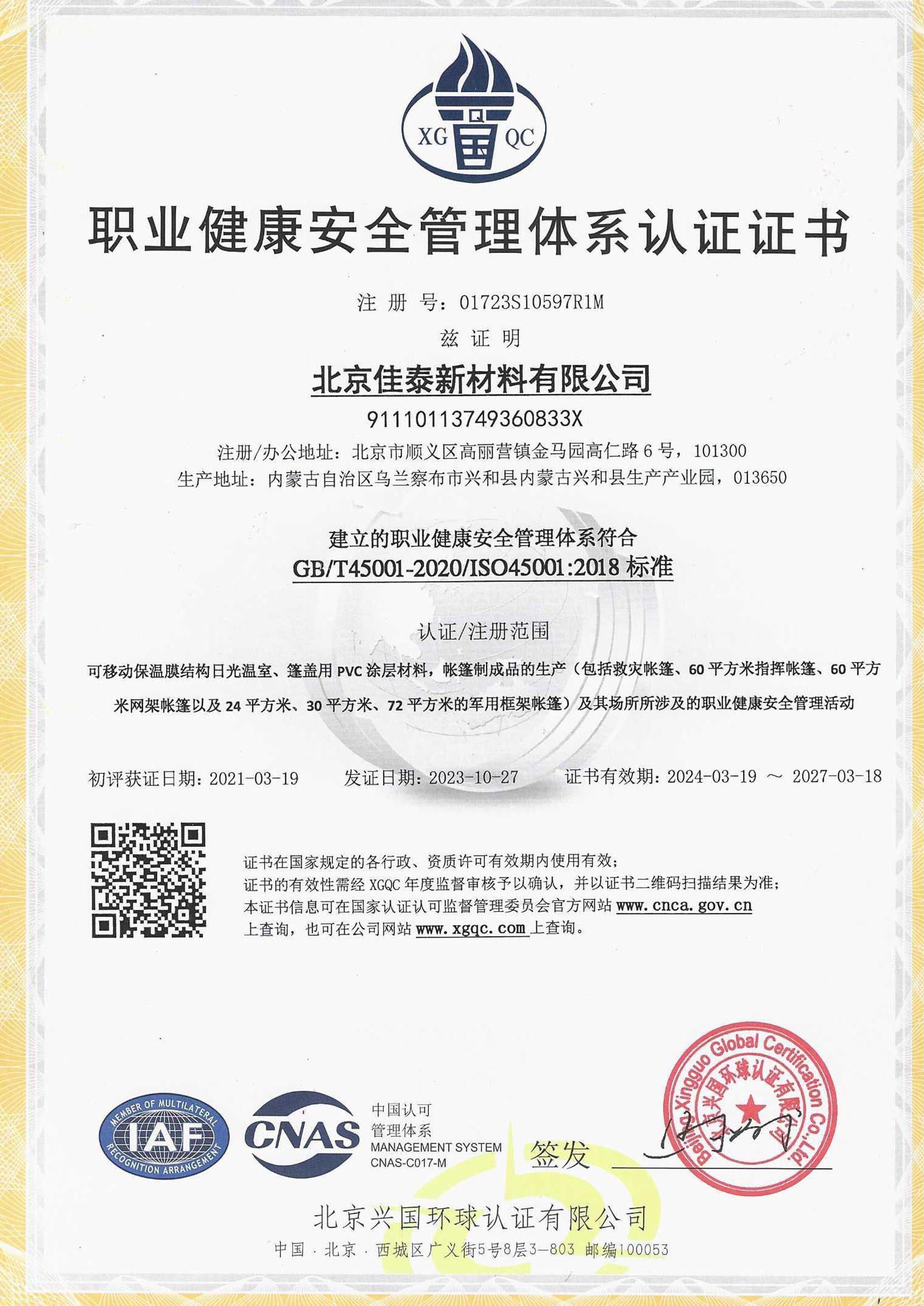 職業(yè)健康安全管理體系認證證書(中文)