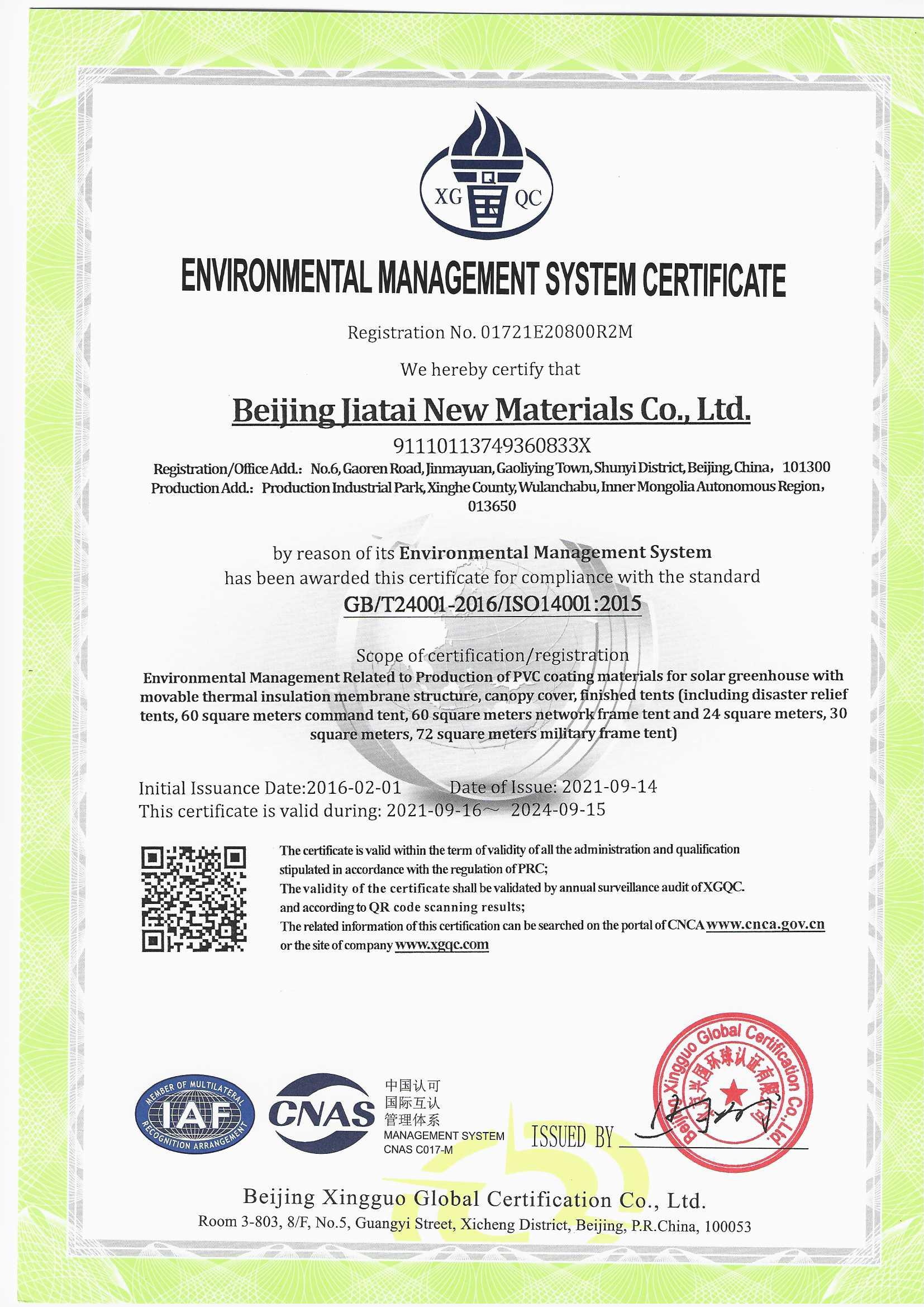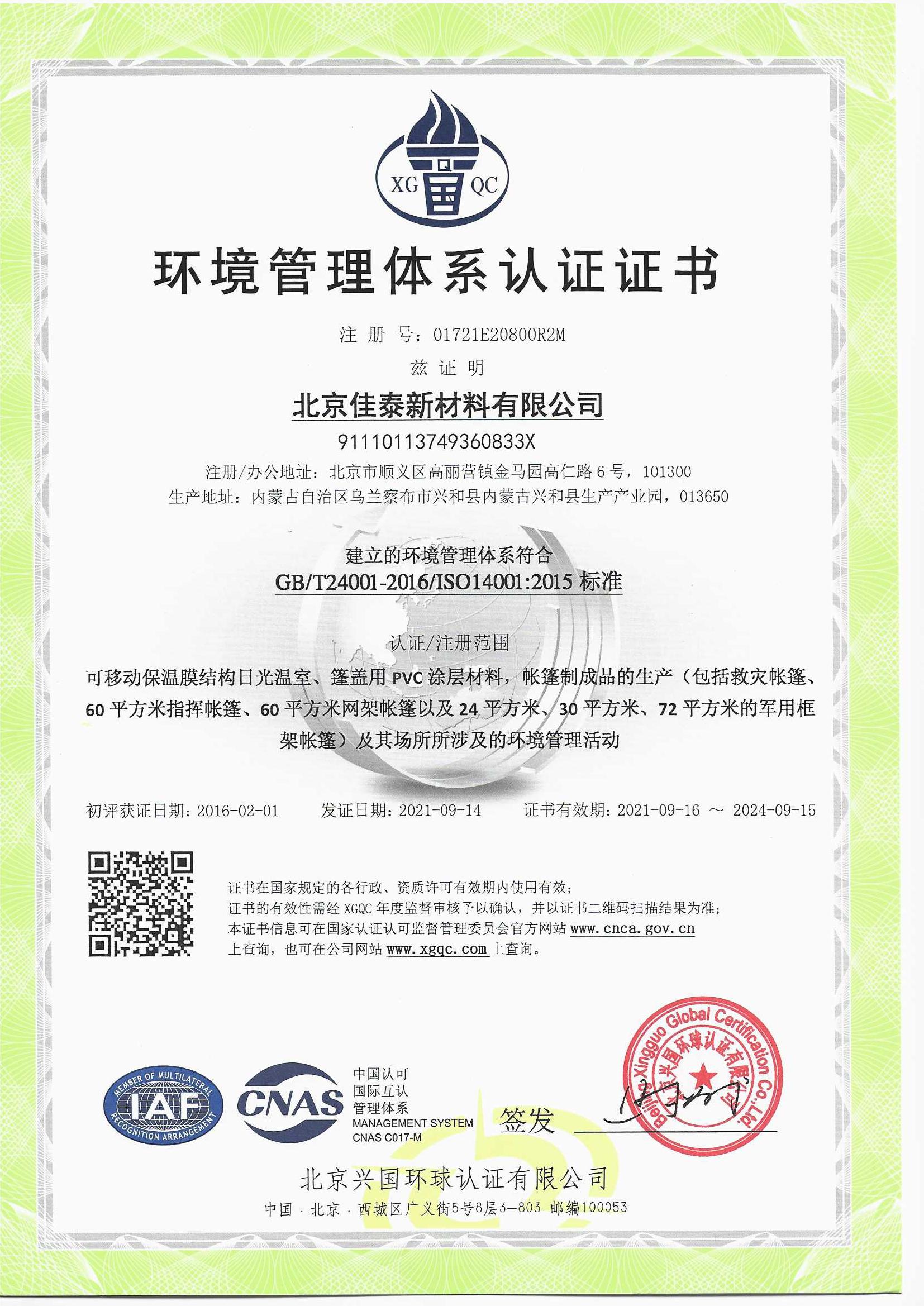 環(huán)境管理體系認證證書(中文) |